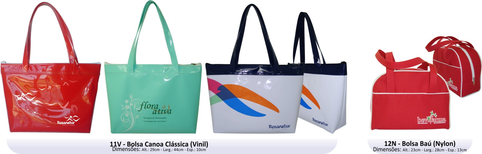 • Confeccionadas em diversos tipos e combinações de materiais. • A maioria das bolsas podem ser confeccionadas em todas as variações de tecidos. Ex: uma bolsa que está no site em verniz pode ser confeccionada em nylon, outra que imagem está em pvc cristal pode ser confeccionada em verniz e assim por diante. |